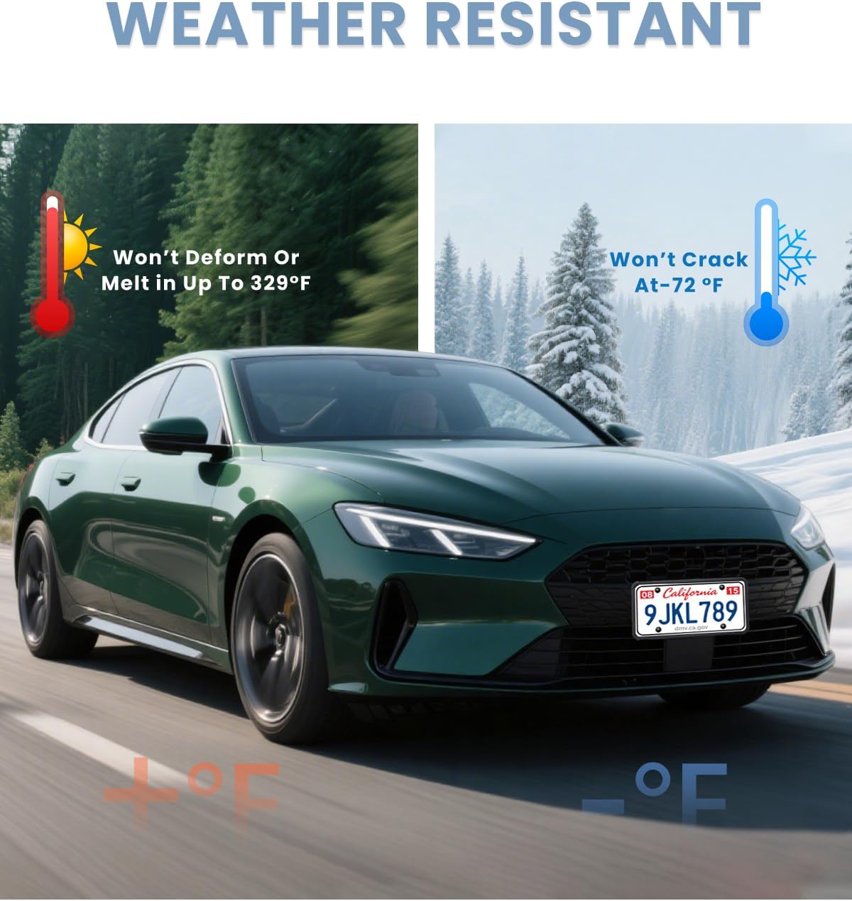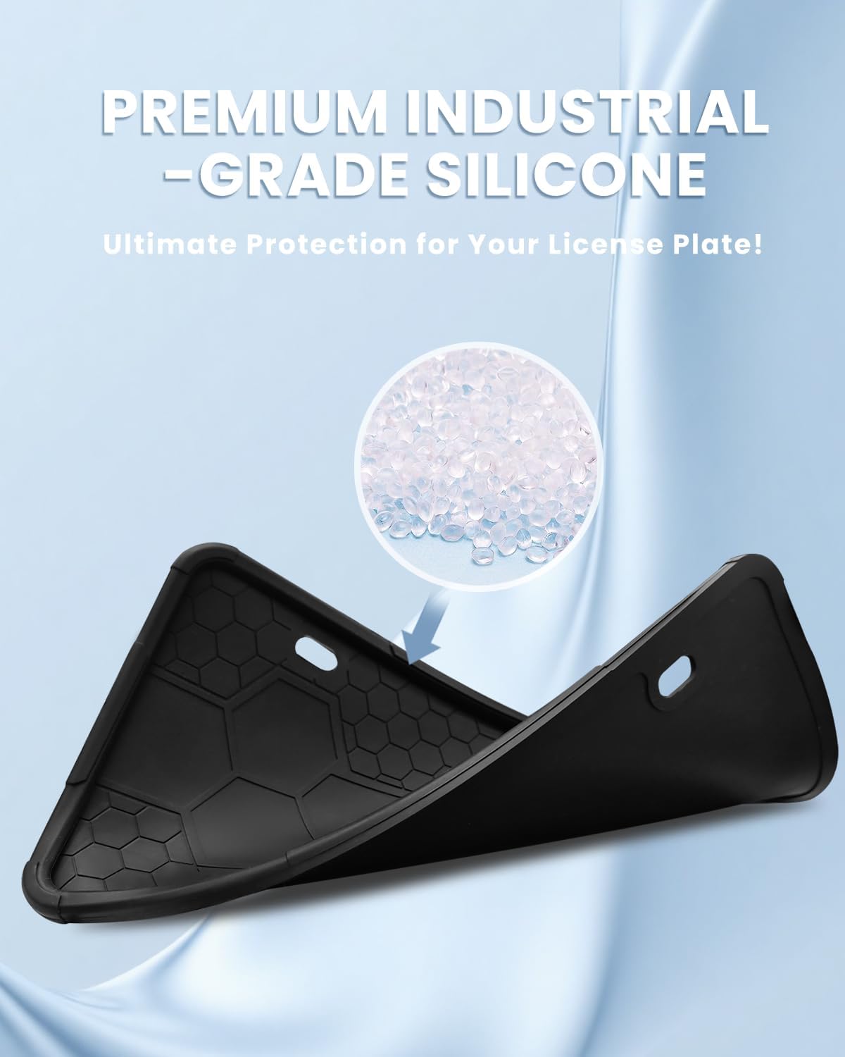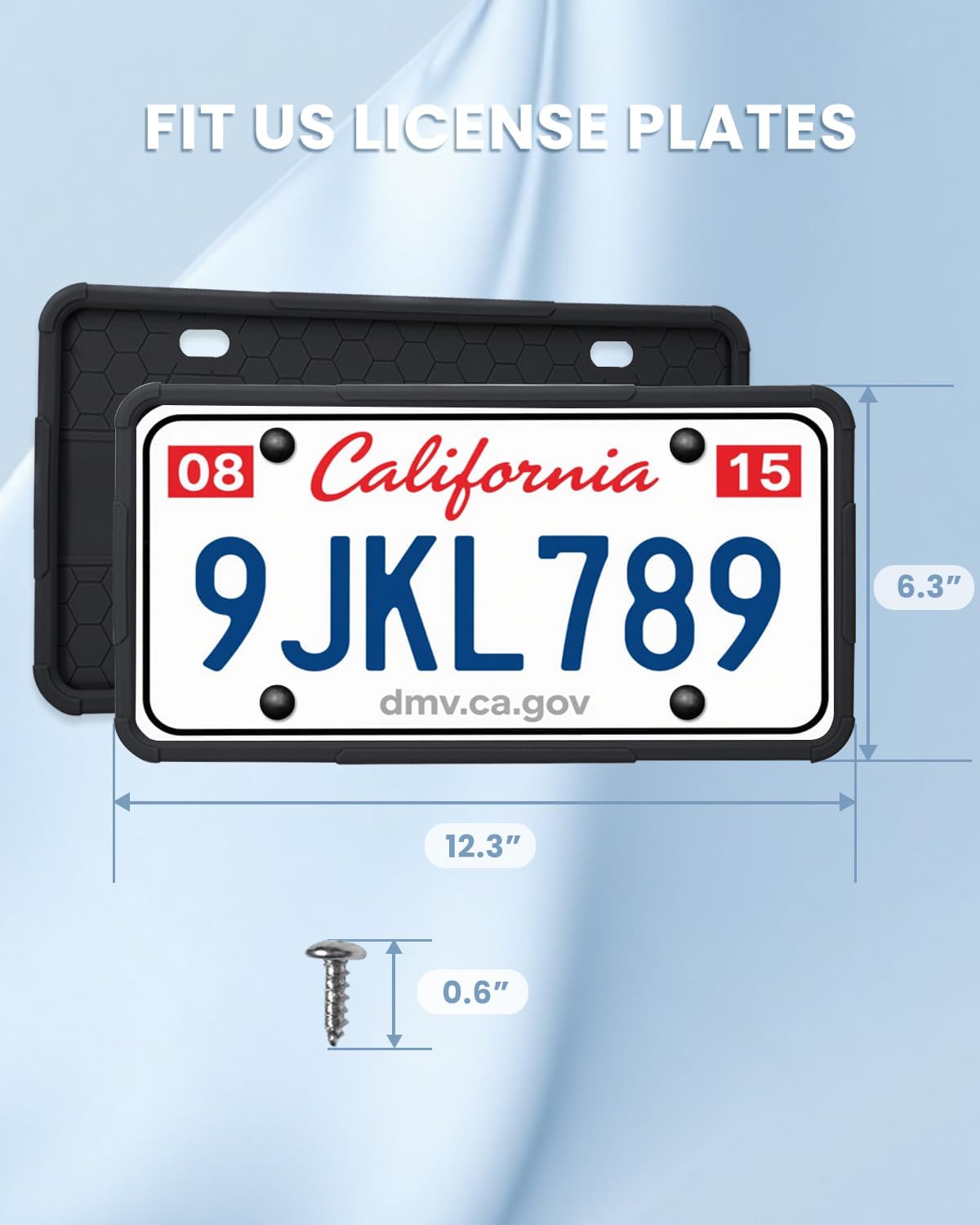 These universal black silicone license plate frames are shockproof and weatherproof. Easy to install with included mounting accessories, they protect plates from rattling, rust, and damage in all conditions.