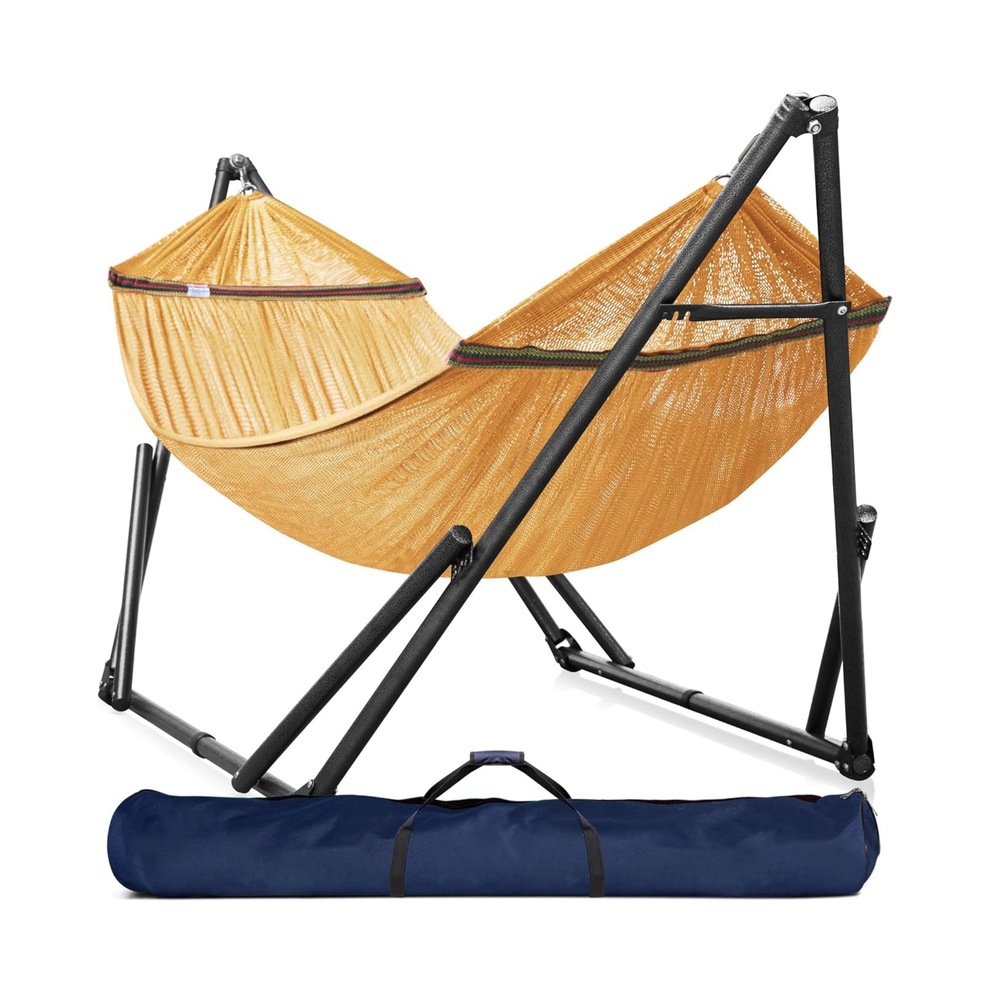 This Tranquillo double hammock supports up to 600 lbs and includes a foldable stand and carry case. Perfect for indoor, outdoor, or camping use, it offers comfort and easy portability.